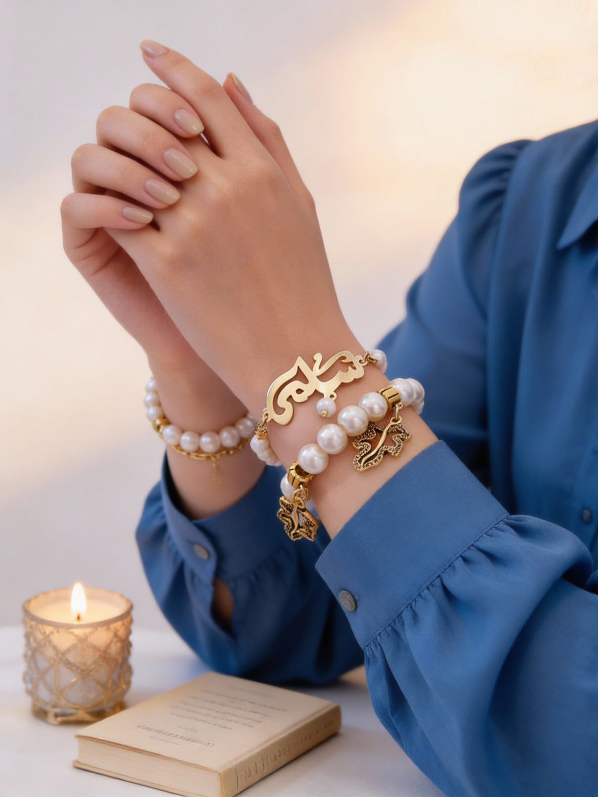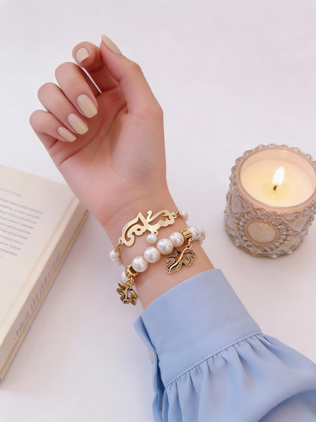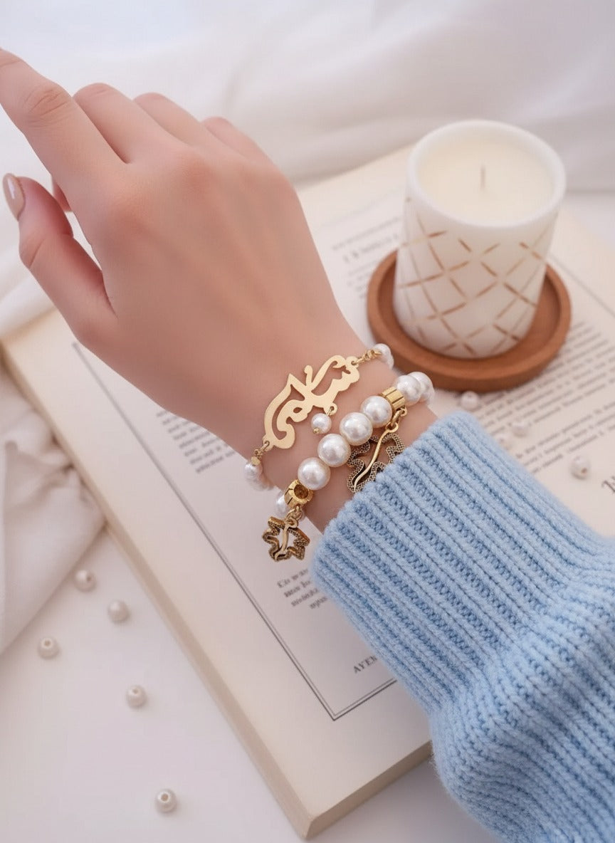 اسم مخصص مع سوار من اللؤلؤ - مطلي بالذهب