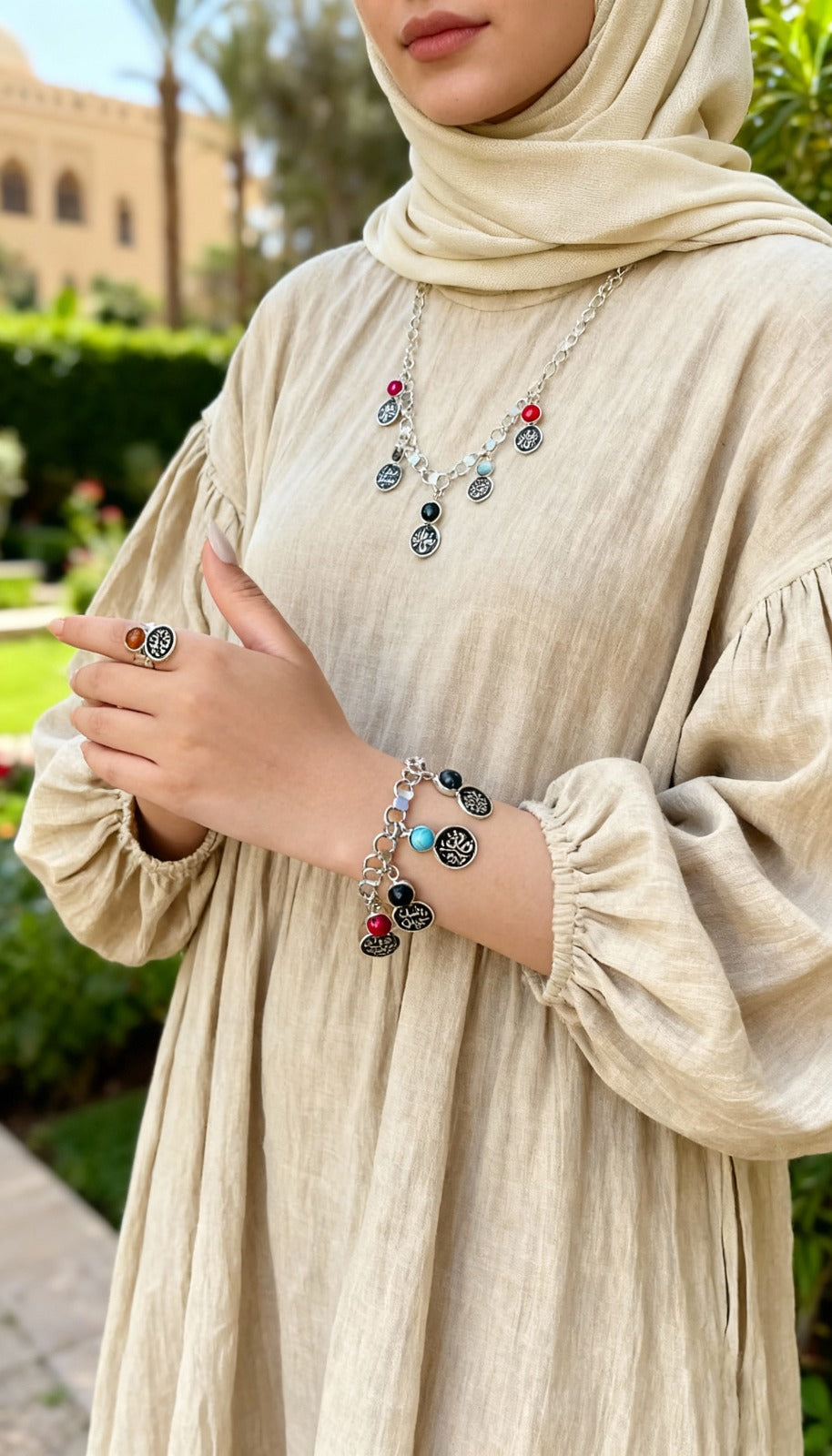 - مادة الحجر: نيكس ، فيروزي، ودلايات مزخرفة بالخط العربي